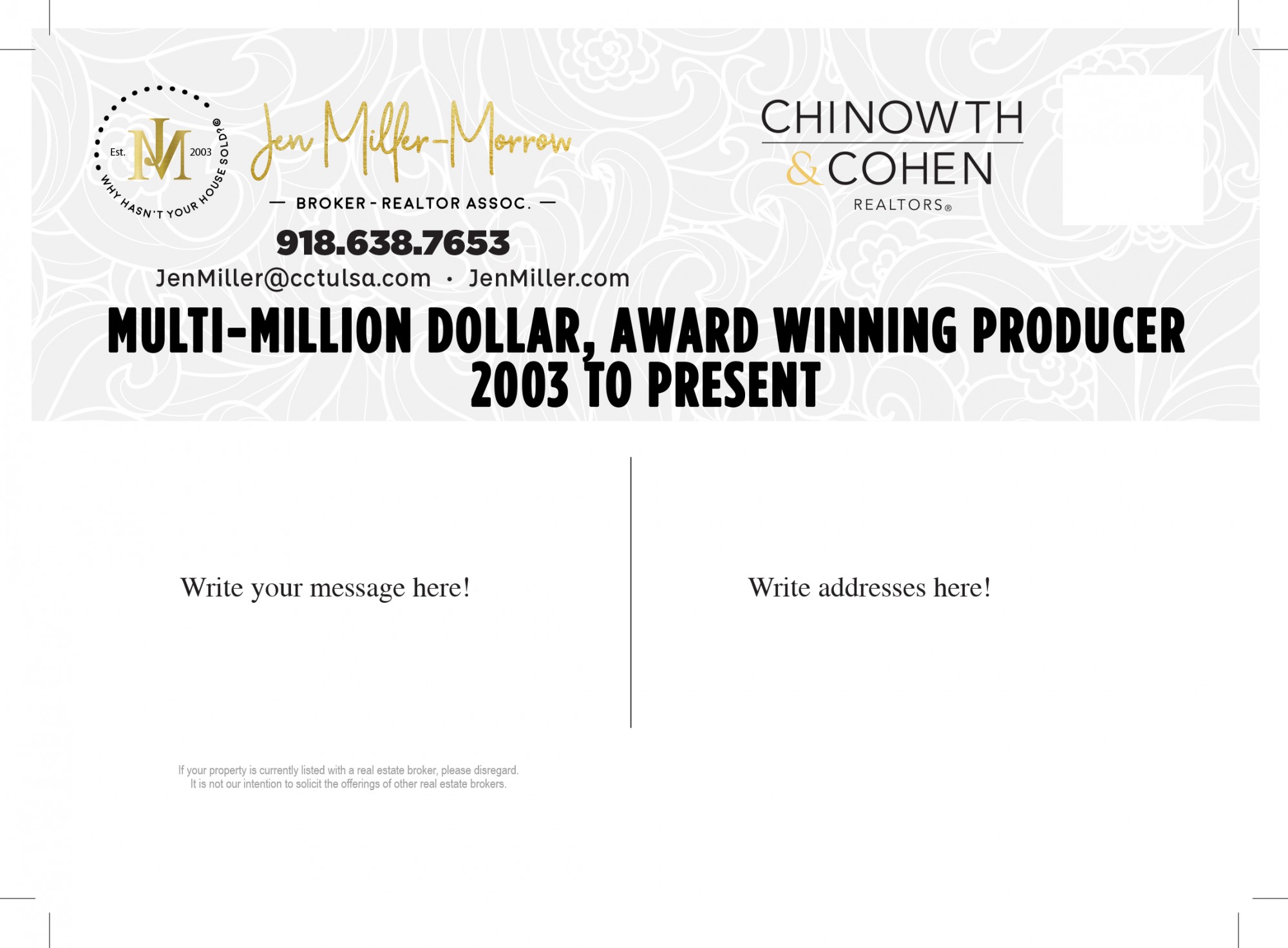 As a local area expert with knowledge of Tulsa and the surrounding areas, my objective is to work diligently to assist you in meeting your real estate goals. I use the latest techniques to market your home, I advertise heavily in the newspaper, Homes & Land, Chinowth & Cohen's Elite Magazine, real estate guides and the internet. Jennifer also holds her brokerage license. When you are buying or selling property in today's real estate market, it's important to have confidence in your real estate professional. My commitment as your local REALTOR is to provide you with the specialized real estate service you deserve.